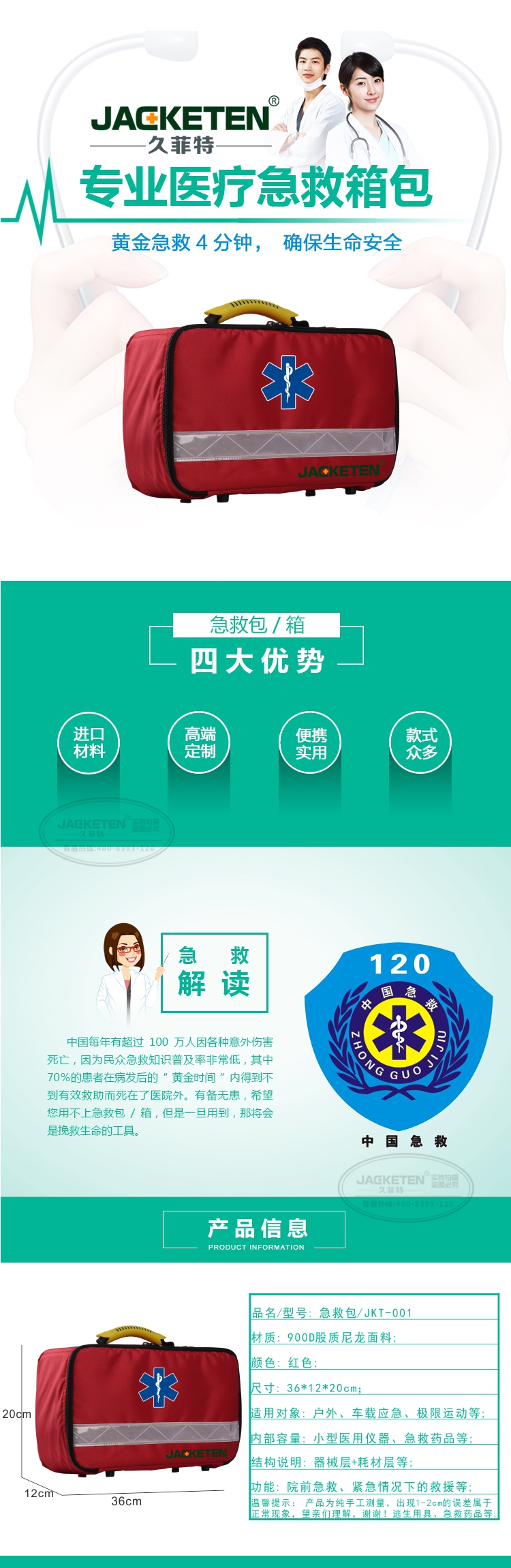 品名/貨號:急救包/JKT-001;材質(zhì):900D股質(zhì)尼龍面料;顏色:紅色;尺寸:36*12*20cm;適用對象:戶外、車在應(yīng)急、極限運(yùn)動等;內(nèi)部容量:小型醫(yī)用儀器、急救藥品等;結(jié)構(gòu)說明:器械層+耗材層;功能:院前急救、緊急情況下的救援等